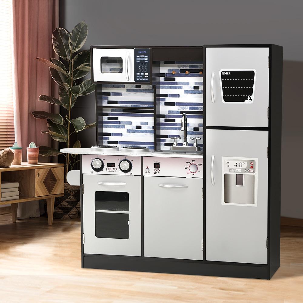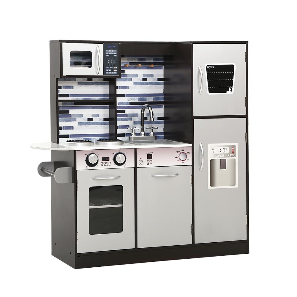 Designed to look and feel like a real kitchen, our Keezi Wooden Kitchen Play Set promises hours of pretend cooking fun for the little chef in your child. It is built at just the right size for any three-year-old and above to have a great time simulating cooking techniques, learning kitchen safety and etiquette and a whole lot more. The play set includes working knobs, kitchen components like tap, sink, stove, oven, microwave, fridge with built-in water dispenser, utensil hanger, storage shelf, towel rack and even a dishwasher to wash up after all the cooking and eating are done. Certified child-safe, our sturdy kitchen play set is ready to help your child develop his or her organisational skills in the most fun way possible.